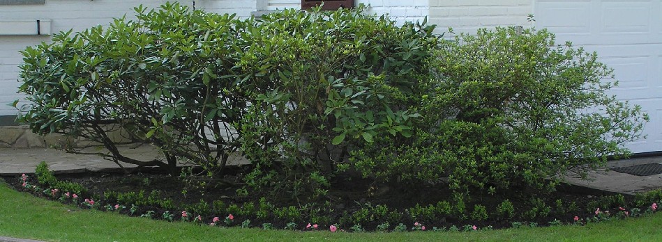 Le jour où ce massif de rhodos a dû être taillé pour des raisons d'envahissement de fenêtres, manque de clarté etc,... il a cessé de fleurir normalement pour ne plus donner qu'un bouquet ou deux aujourd'hui. En optant pour des "nains", je pensais éviter la taille annuelle de l'arbuste.