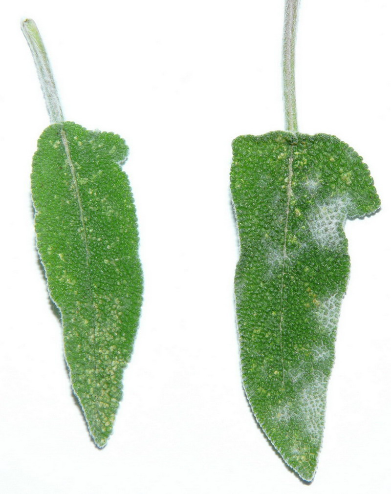 Ma sauge cultivée en pot presente de nombreuses feuilles tachées (photo de gauche), jaunatre. Ce n'est pas le cas de toutes les feuilles, certaines sont tres belles.