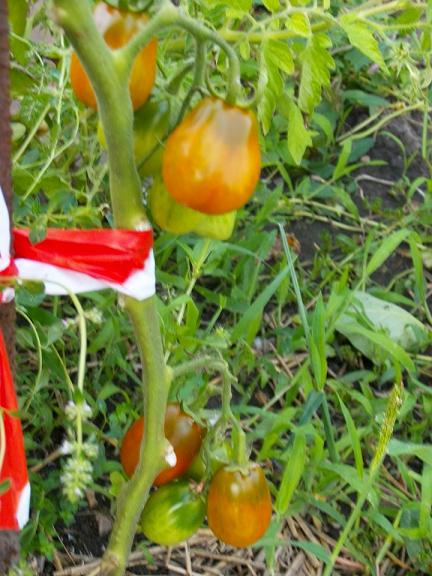je lui ai donné le nom de "mini coeur de bâgé" elle pousse avec de gros bouquets , comme toutes les tomates cerises 12 à 20 fleurs! mais regardez donc la forme des fruits