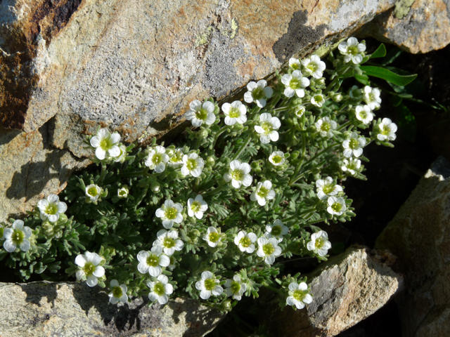 fleurs solitaires sur pédoncule court , feuilles velues trilobées.. série saxifraga exarata le plus probable..