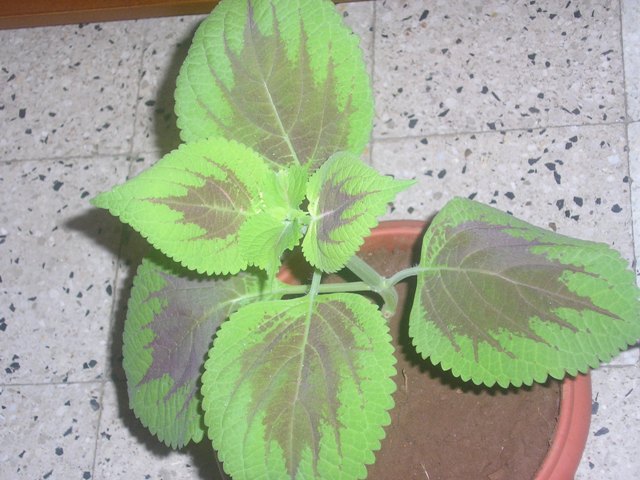 Un Coleus, ce me semble, mais je peux difficilement t'aider sur sa culture ; Il y a très longtemps que je n'en ai plus. Je me souviens l'avoir bouturer en laissant une branche raciner dans un verre d'eau. Le Coleus aime la lumière vive. S'il est planté à l'ombre, il prends de la hauteur mais sans densité.