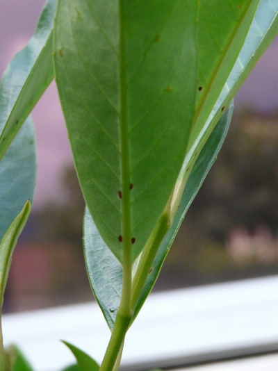 Désolé pour les photos mais je les ai prises un peu rapidement. Pour te donner plus de détail, je te précise que les points rouges sont en général au nombre de 6 sur chaque feuille,réparti de chaque côté de la nervure.