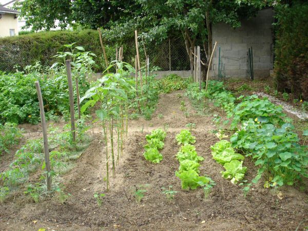 En fait il y a un rang de capucines au fond, puis un rang de tomates normales puis une allée, puis deux rangs de tomates trop grandes, puis les tournesols jaunes, puis les pommes de terre devant...