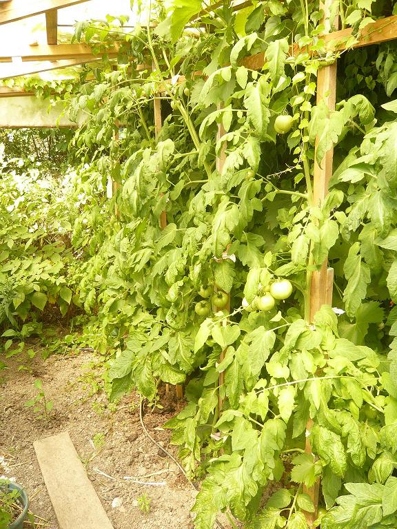 A propos du tuteur horizontal il a aussi un autre rôle ,celui de rigidifier la structure d'ensemble de mes plants et cerise sur le gateau (n'utilisant aucun produit tel bouillie bordelaise) je peux protéger mes plants de la pluie qui est la source du mildiou.