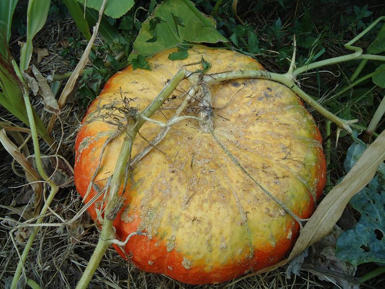 j'aimerais que l'on m'éclaire sur l'état d'un de mes potiron. C'est un Rouge Vif d'Estampe, tout beau, côtelé et tout rouge. Pensant le récolter je l'ai retourné pour couper le pédoncule... et là oh quelle tristesse!!