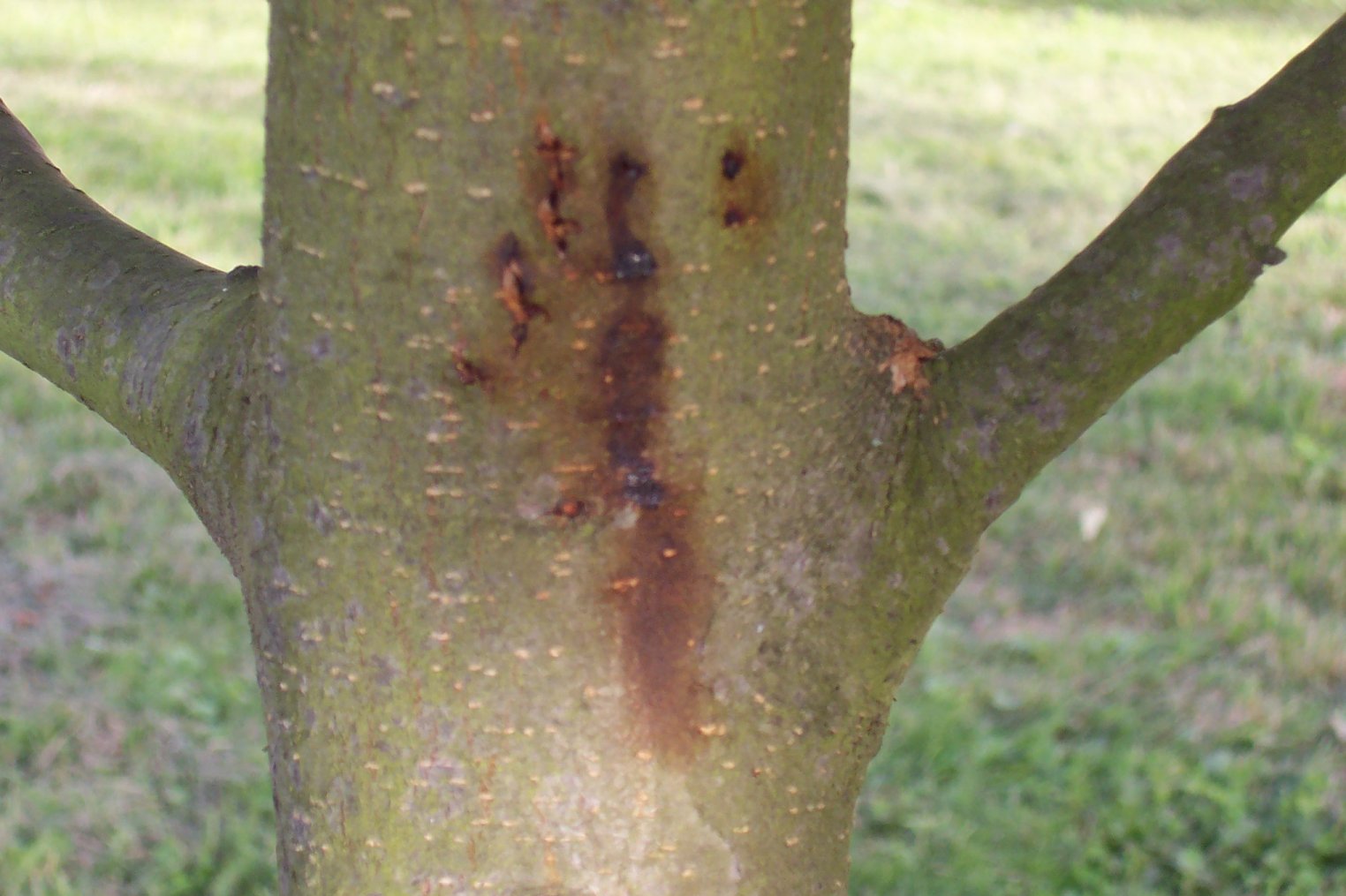 Je ne m'y connais pas encore assez en matière de maladies d'arbres, mais j'espère qu'il ne s'agit pas d'un ver qui creuserait dans le tronc (Zeuzère??) ou de chancre?