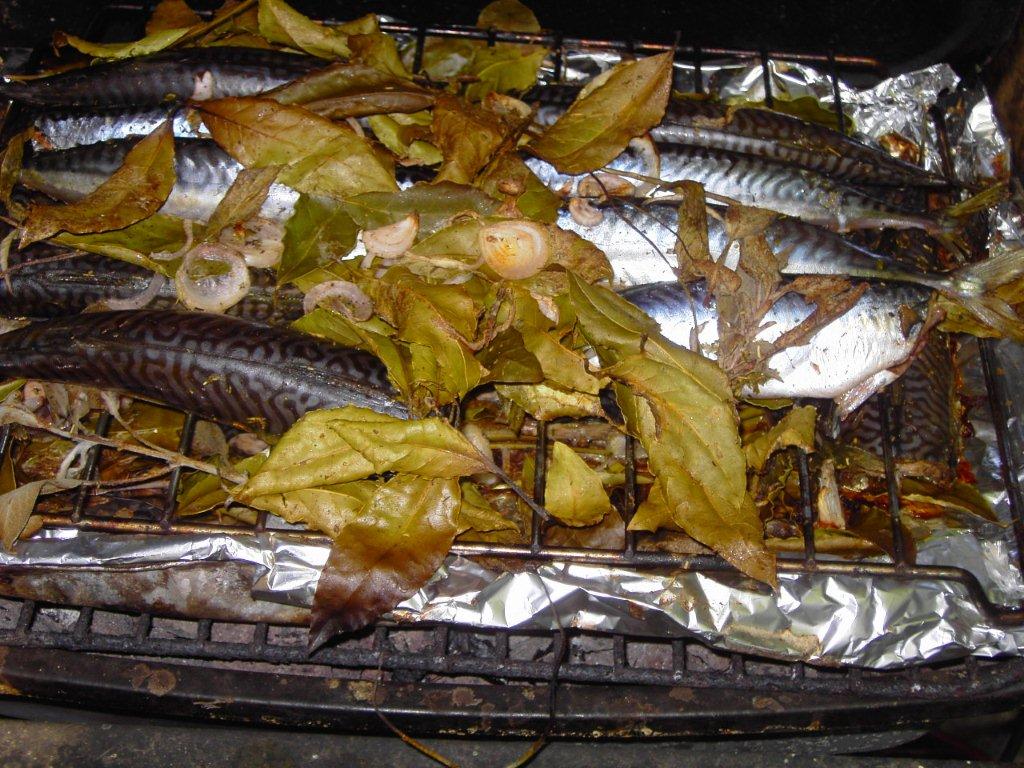 Maquereaux sur deux niveaux , le premier repose sur un tapis de petites branches de laurier et le deuxième niveau posé sur la grille.Ainsi grille 06 Kilos de Maquereaux bien assaisonnés.