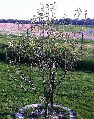 Tu as de la chance, ton arbre est assez bien formé ; et comme il a l'air d'avoir de la vigueur, tu devrais penser à la hauteur future de tes cueillettes.