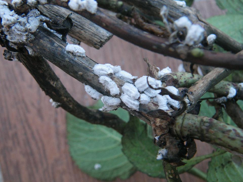 voici les taches blanches trouvées sur mes hortensias !! Est ce un champignon ? dois-je couper le sbranches infectées ? à quoi est ce du ? dois-je tout arracher ?