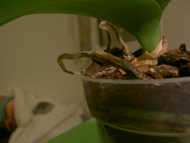 Et j'ai quelques racines qui sortent du pot qui sont marrons et molles, comme mortes, dois je les couper? Rempoter?
