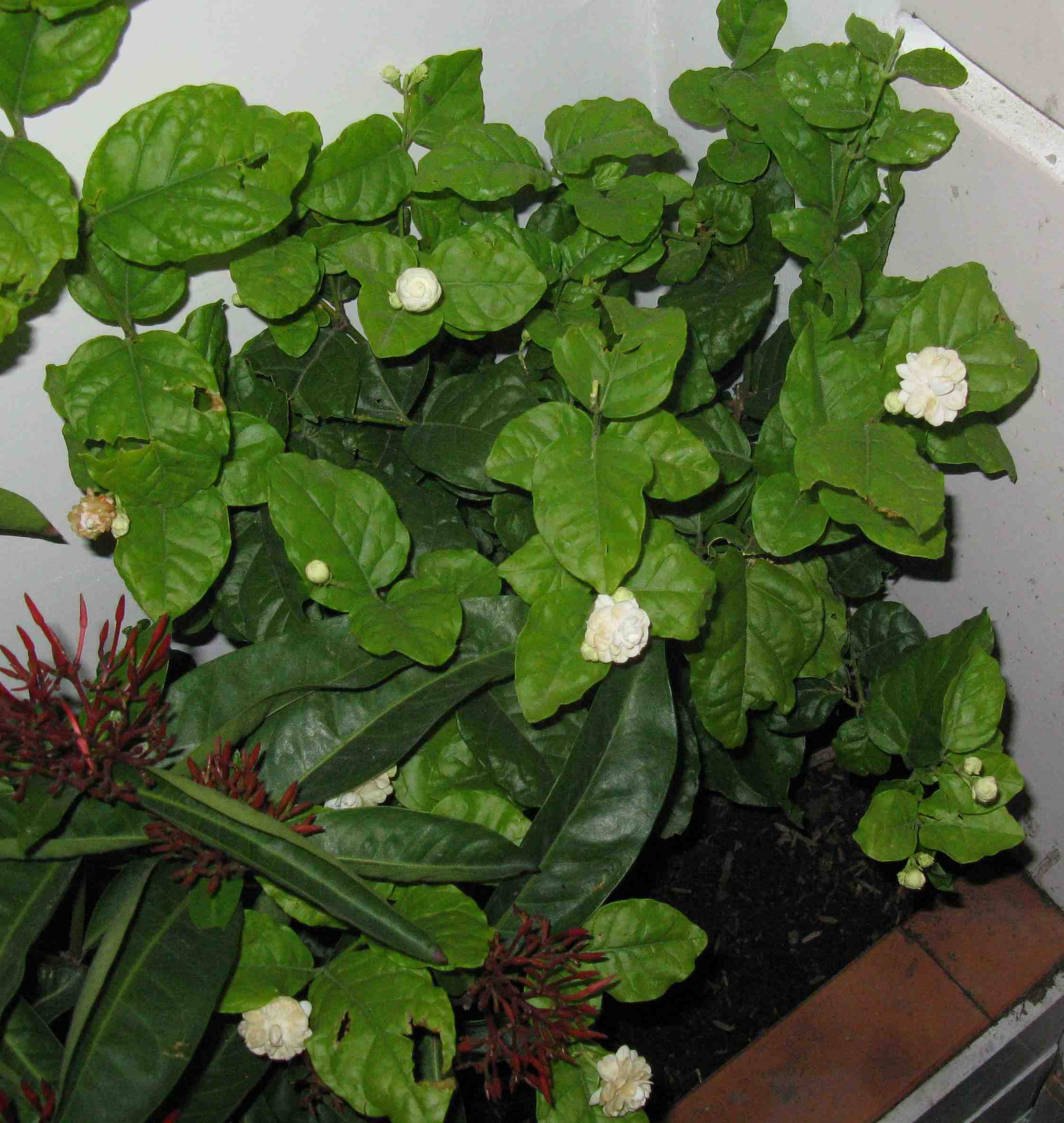 J'hésite entre Jasminum sambac et une plante qui n'est pas du tout son cousin bien que surnommée Jasmin-café par les Polynésiens : Tabernaemontana divaricata , qui est une Apocynacée et non une Oléacée comme les Jasminum.