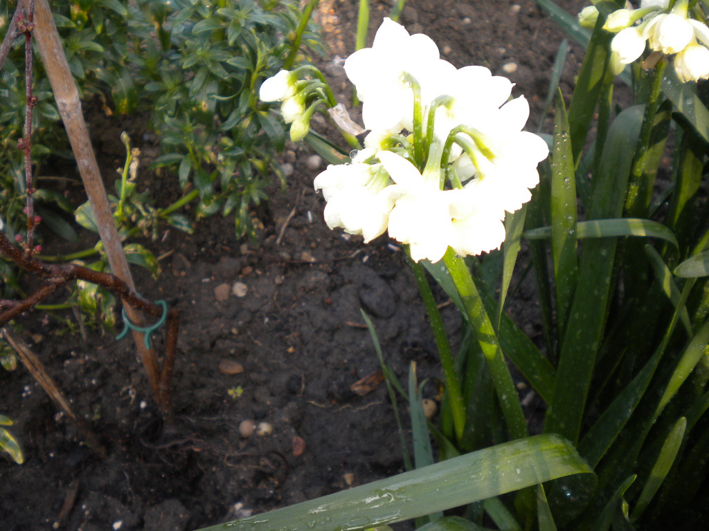 Non mes narcisses ne relèveront pas la tète les tiges se sont pliées par le poids elles touchent terre et se sont faites éclabousser de boue par la pluie . C'est très contrariant, parce que ce sont des narcisses doubles et aussi les jonquilles .
