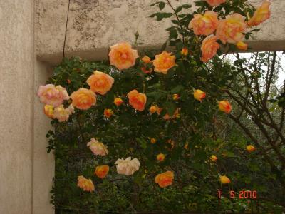 Nous avions un vieux rosier de 15 ou 20 ans qui grimpait devant notre cuisine, qui faisait des roses jaune orangé bordé de saumon du mois de mars au mois de janvier (peu l'hiver mais toujours une ou deux). Il n'a malheureusement pas survécu au déplacement fait pour agrandir la cuisine, malgré les soins du maçon qui l'avait enlevé avec une grosse motte et l'arrosait régulièrement. Il était beau mais perdait pas mal de feuilles avec la maladie des taches noires. Mon mari le regrette encore mais est prêt à changer de couleur pourvu qu'il ait de belles roses une bonne partie de l'année.