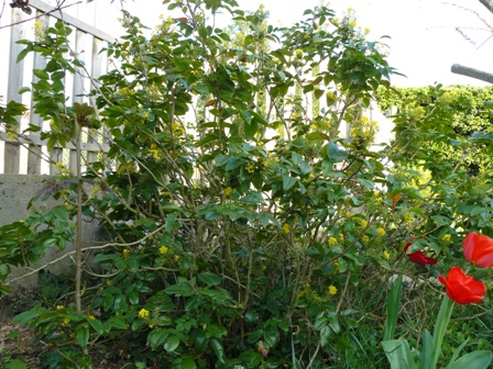 cet arbuste est est bientôt en fleurs : celle là met de petites fleurs jaunes : là c'est un arbuste taillé en boule avec longues feuilles effilées hélas pas encore en fleurs :