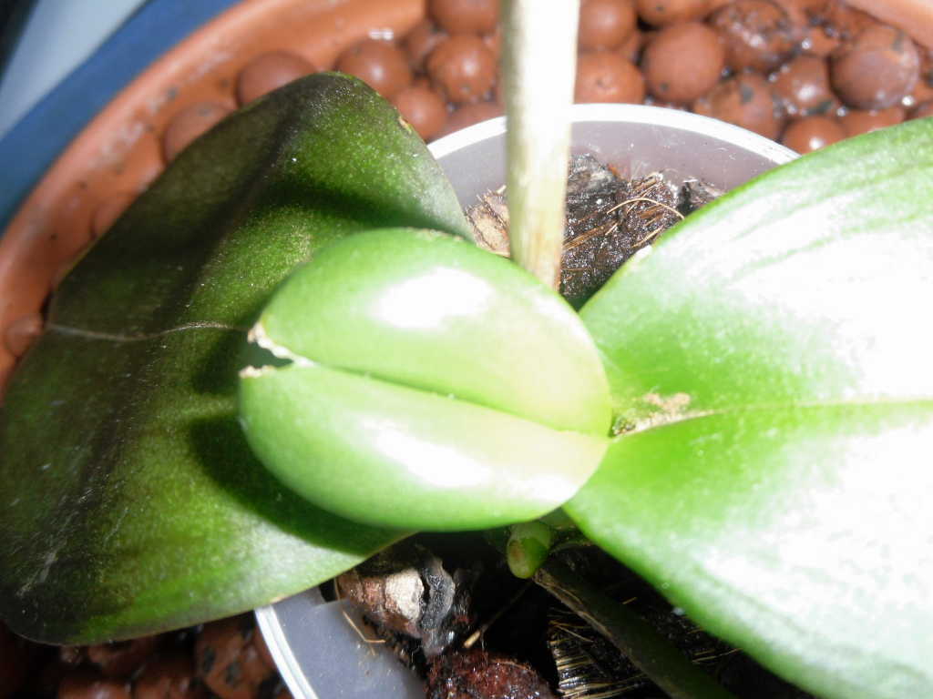 Les feuilles déjà existantes ont une drôle de couleur (pas tout à fait vertes, mais pas marrons non plus, un peu ridées, mais pas trop molles), mais la jeune feuille continue très lentement de pousser. J'ai un keiki qui pousse sur la hampe restée verte (je vois poindre deux bourgeons de racine), et quatre bourgeons à la base de la plante. Je suis certaine que deux de ces bourgeons sont des bourgeons de racine. Pour les deux autres bourgeons, j'ai un doute: un pousse entre deux feuilles, et m'a l'air de pointer vers le haut (hampe?), et l'autre vient de pointer le bout de son nez, donc difficile de savoir ce que c'est (racine, ou rejet).