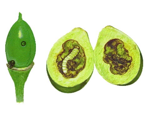 Sur les qqs fruits restant je m'aperçoit que ceux-ci ont été "visités" par ce qui semble être une larve (voir photos).