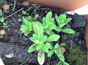 Des myosotis certainement, vu l'échelle par rapport à la taille des billes d'argile, et un asparagus. Non ?