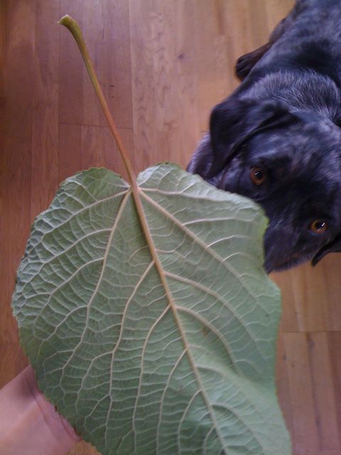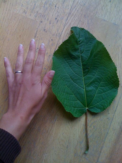 Cet arbre possède grosses feuille (20cm/15cm environ) Nombreuses nervures teintées de rouge à la base, ainsi que le pétiole: