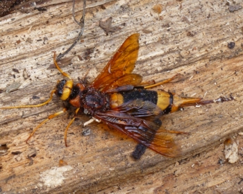 il s'agit d'un symphite appartenant aux hyménoptères .. ici c'est la femelle urocerus gigas voila :))