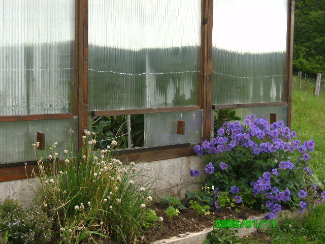 A l'intérieur de la serre et près des ouvertures il y a géranium vivace, ciboulette (qui fleurissent tôt), thym, sauge et lavande, pas de problèmes pour la pollinisation.