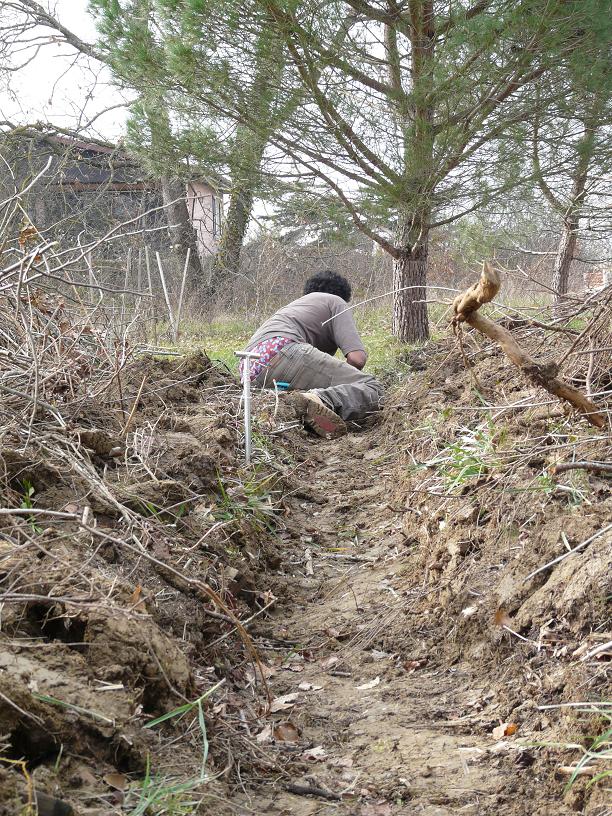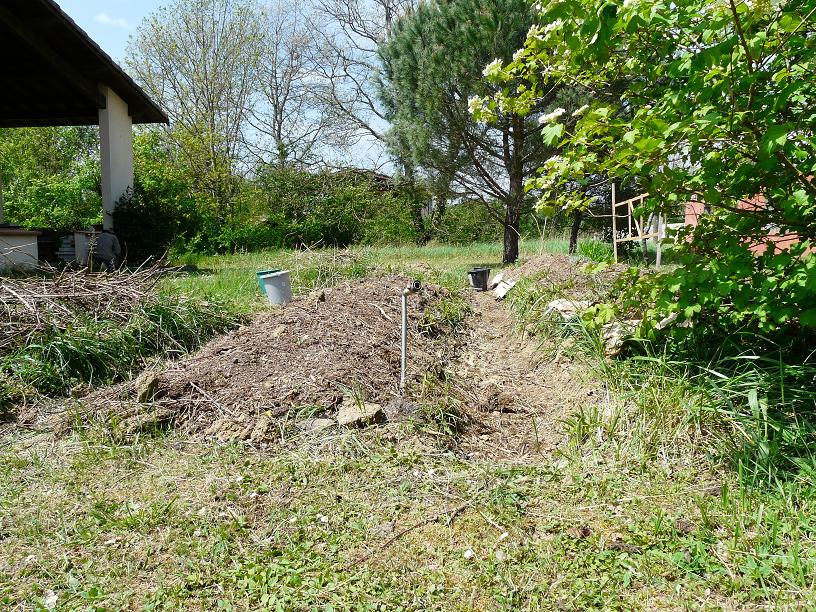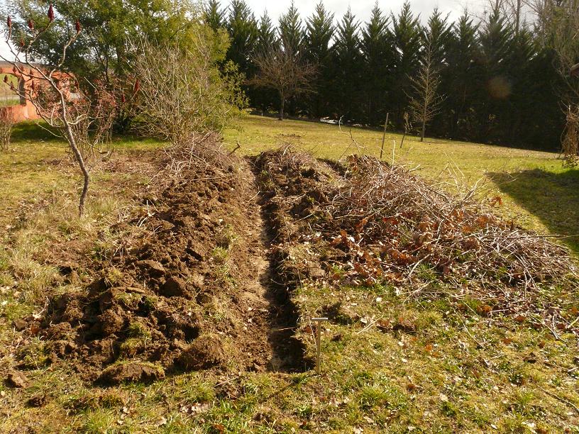Alors a l'automne on a délimité le futur potager. Je me suis inspiré de différentes sources et méthodes telles que celle de J.M. Lespinasse, E.Hazelip... En février Chéri m'a donc créé des buttes avec la terre des rigoles inter-buttes.