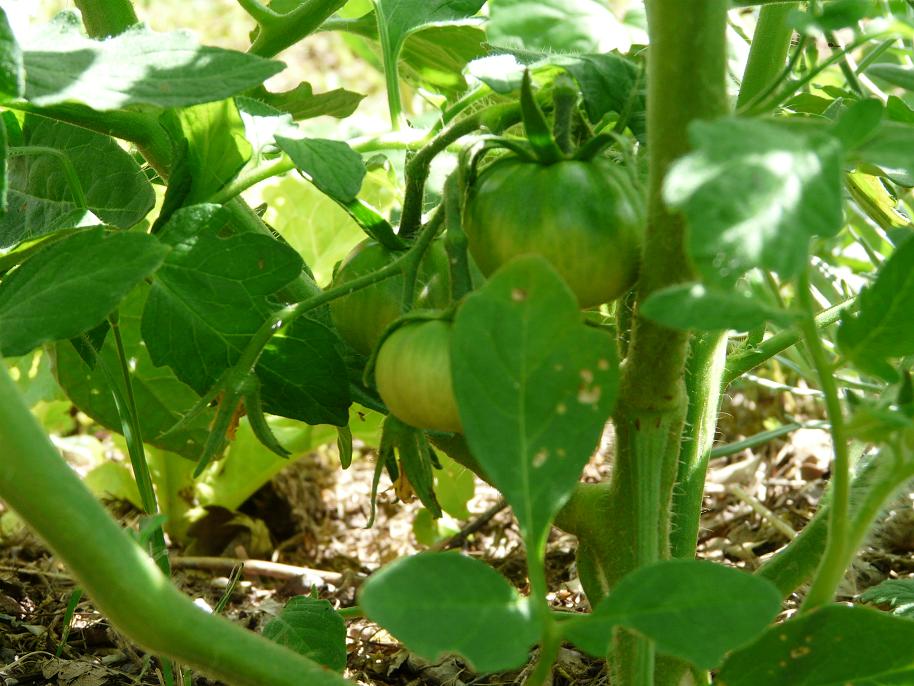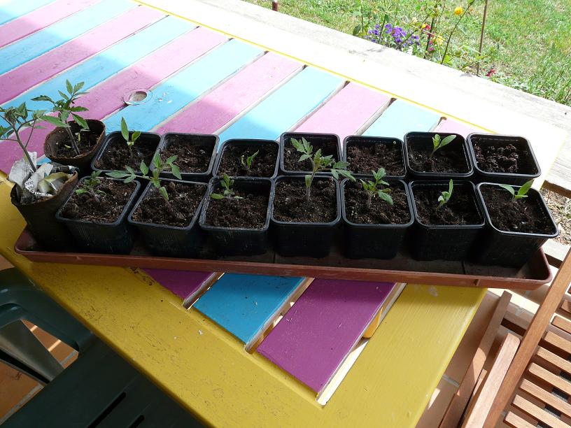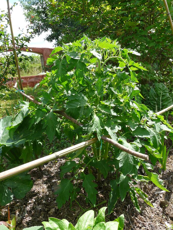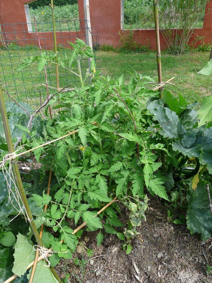 Les tomates que j'avais semées et repiquées les plus tôt dans le potager sont les plus vigoureuses. J'ai ai acheté 3 chez un pépiniériste (téton de vénus, d'auragne, et ?? ) et maman m'en a donné 2 (des cœurs de bœufs).