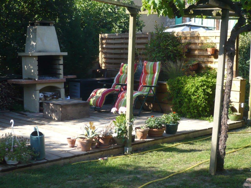 Après deux ans de silence sur ce forum, même si je reviens souvent prendre conseil et réaliser quelques échanges, je reviens mettre quelques photos. Le jardin a bien changé, j'ai supprimé la terrasse en béton pour la remplacer par une terrasse en caillebotis, le puits y est intégré, j'ai aussi supprimé les carrés (snif) pour agrandir le potager, j'ai fait deux murets de séparation du jardin d'agrément avec le potager, construit un barbecue en dur,la serre est toujours là avec les mêmes soucis de pollinisation. J'y ai planté un chouchou (chayotte) qui fait quelques fuits mais est atteint de maladie.. Une guerre sans merci se livre du côté des pucerons et des coccinelles sur les deux planches de haricots, je n'ai jamais autant vu de coccinelles dans mon jardin, il faut dire qu'elles ont largement de quoi se nourrir !