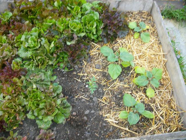 une planche d'anciens plançons de salades, que j'vais laissée ! en fait je coupe et je me suis aperçu que les laitues "mme bolard" repommaient à merveille! 1 plant tomate "sauvage" + aubergines monstrueuse de new york donc c top