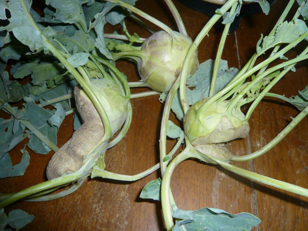 Voici le maigre résultat de l'essai de culture des choux-raves qui se résume à ça : Comme on peut le constater sur les photos les pauvres ont subi des attaques successives de chenilles ou limaces ou peut-être les deux puis en fonction de l'arrosage et des fortes chaleurs certains ont éclatés puis se sont remis à grossir.