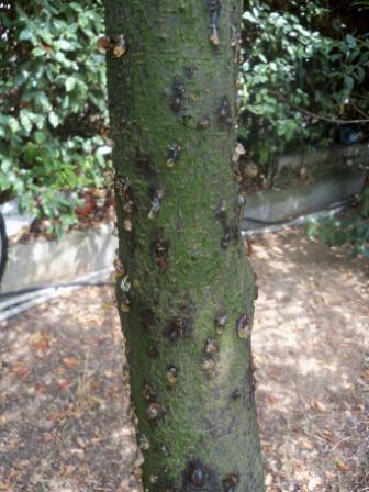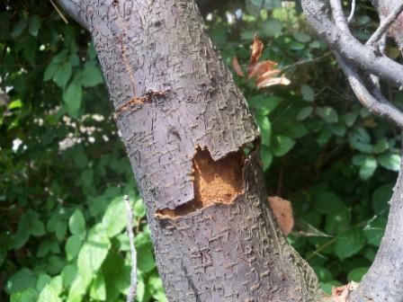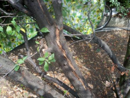 Certaines branches présente un éclatement du bois. Sur certaines partie, l'écorce se détache du bois.