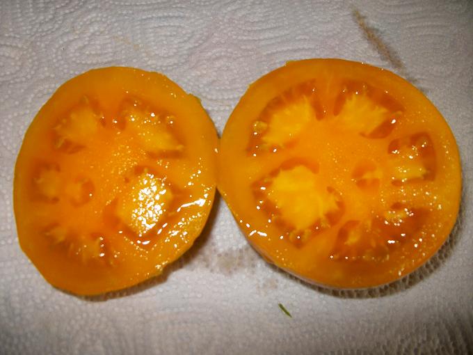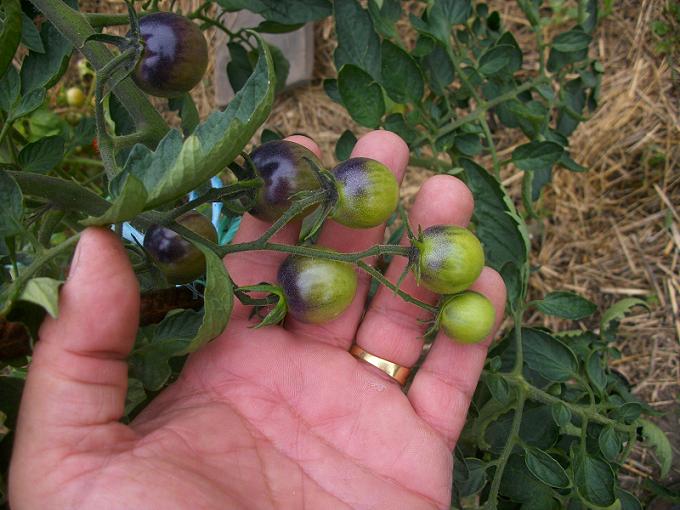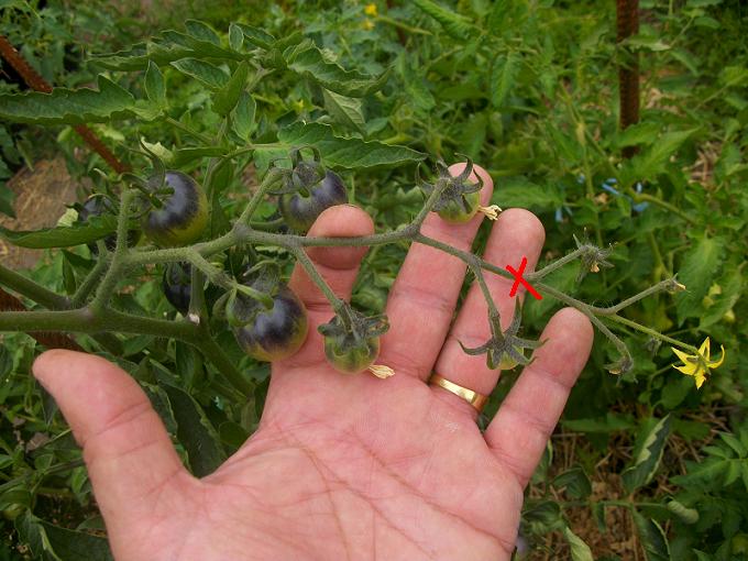 et là, l'on voit nettement que ce fruit à été hybridé"! c à dire que sa fleur à reçu la visite d'un bourdon . Bourdon qui lui aura butiné plusieurs variétés diffèrentes. je ne récolterai pas de graines de cette tomate! c pour cela que je place sous voile insect-proof, certains bouquets pour conserver la pureté variétale!