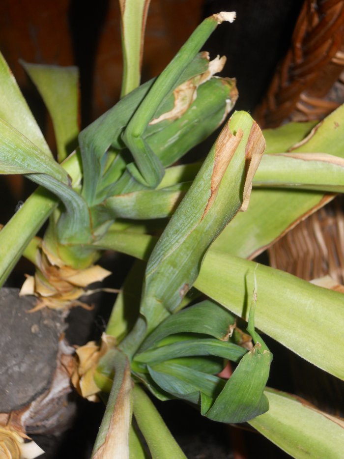Hier soir, j'ai ramassé un yucca que quelqu'un avait jeté. Il y avait trois pieds, dont 1 semblait encore vivant. Celui que j'ai trouvé vivant avait encore quelque feuilles vertes et il avait de belles racines rouges. J'en ai déduit qu'il avait eu soif parce que ses feuilles était très recroquevillées sur le bourgeon. Les extrémités avaient séchées. Après une coupe, il ne reste pas grand chose de vivant. Le tronc est en bonne état.