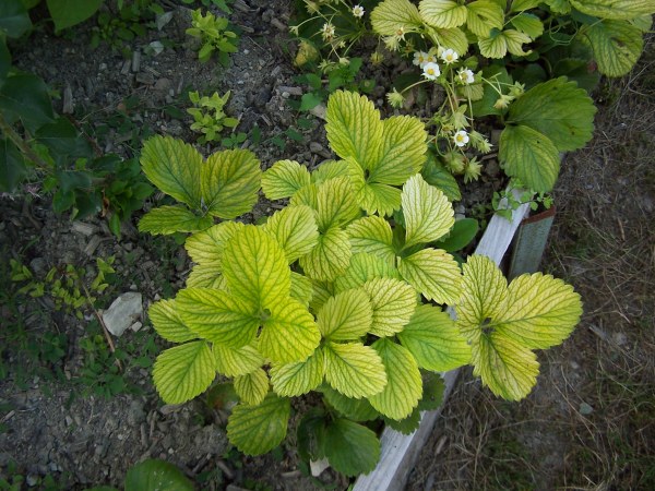 Bonjour, j'ai planté cette année de fraisiers "Marat des bois" ils donnent depuis un mois mais leurs feuilles jaunissent alors que les "Gariguettes" sont bien vertes.