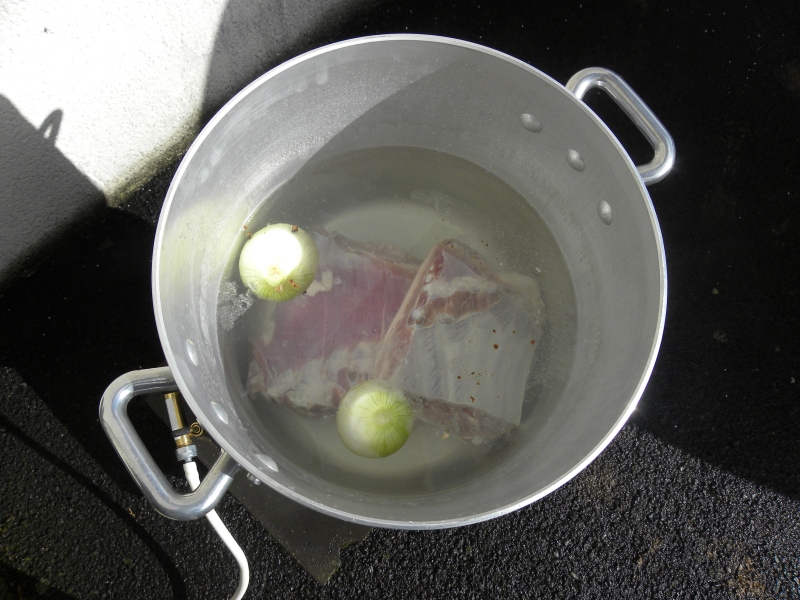 Cuisson dehors avec petit-salé et oignons, 2h30 de cuisson au total, les choux sont rajoutés au bout de 1h30.