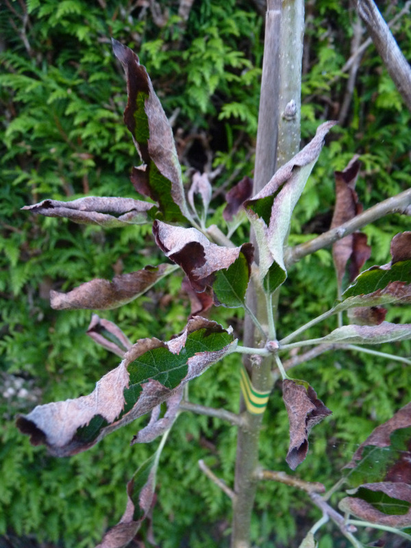 j'hésite encore..entre oïdium et feu bactérien du poirier(qui touche les pommiers aussi malgré son nom.) parce qu'en principe si c'est l'oïdium les feuilles tombent .....