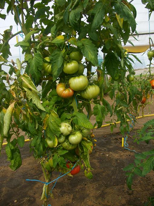 petit reportage sous la serre de mon ami René, à 01 Grièges. Ce sont des plants issus de mes semences.semis fin avril repiquage juin. terre: sable. engrais: patenkali au départ puis du :roll: 35 :?: j'sais plus, un truc avec ce chiffre. par deux fois.