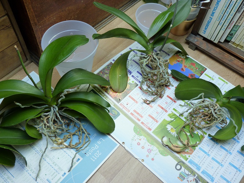 Non tu ne les laisses pas au sol comme ça, tu les remets dans leurs pots en attendant de pouvoir les rempoter. Les baigner (les racines) une fois par semaine + vaporisation plus legere quotidienne, en laissant bien secher entre deux. L'idéal étant de vaporiser le matin.