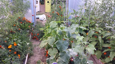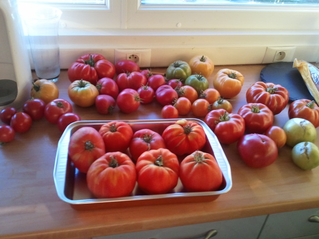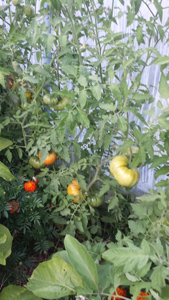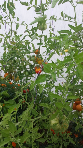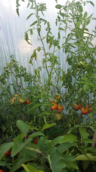 la surface de potager passer de 300 m² à à peine 100 m² et la serre passer de 30 m² à 12 m² donc autant vous dire que c'est pas la même chose à travailler et même si les tomates ont encore une place dominante sous la serre, le nombre de variété est en nette diminution.
