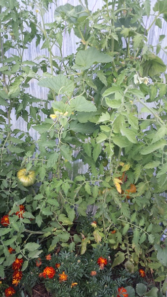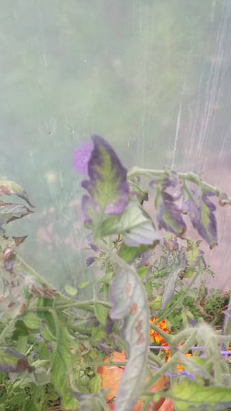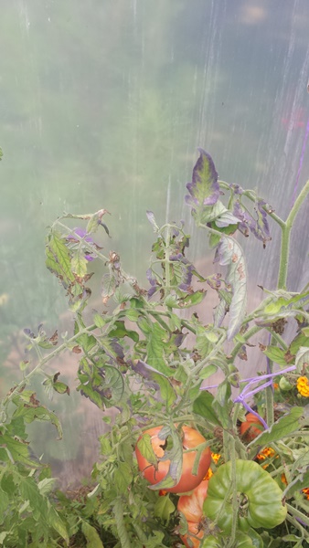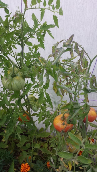 4 pieds de tomate porte des attaque de mildiou. ce sont les pieds qui sont près des portes, comme celles ci retent ouvertes avec les pluies des dernier jours, BINGO j'ai gagné! les autres ne montrent rien de particulier.