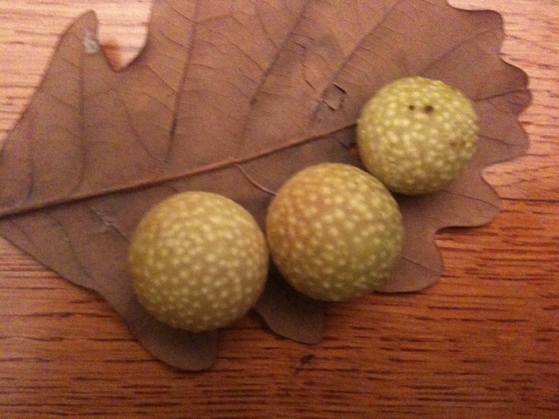 Voilà ce que j'ai trouvé en marchant en forêt cet après-midi. Mystère, mystère. Qui saura me dire ce que sont ces trois petites boules accrochées à une feuille de chêne. J'ai trouvé ça parterre.