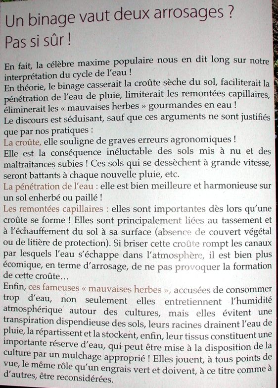 Nous avons tous regardé un jour nos voisins jardiniers retourneurs de sols faire: ils grattent ,sarclent est tirent grande joie a voir leurs culture "propre "sans adventices après tous ces grattages ils disent: c'est sec! et ensuite arrosage! le sol est nu tous le temps.Ils récoltent mais a quel prix? ils ne sont pas partisans du moindre effort!La nature est leur esclave.
