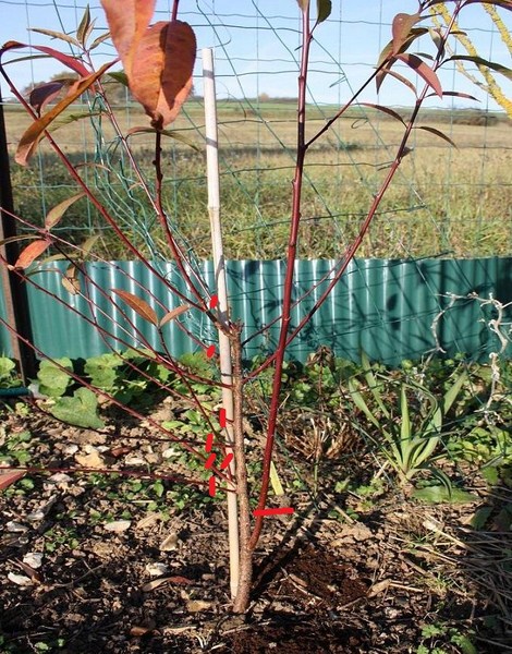 Pour ma part, je conseillerai plutôt de commencer à former l'arbre donc je taillerai les branches comme sur la photo ci dessous :