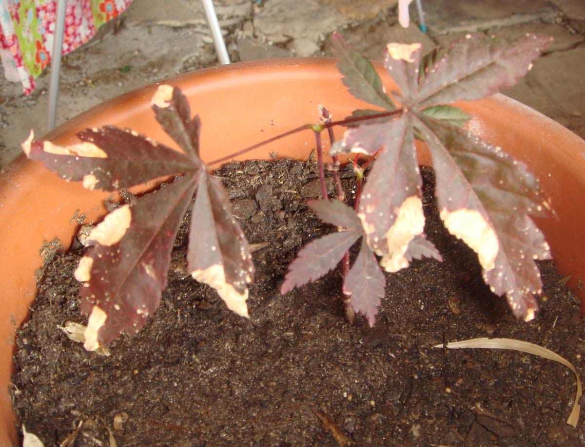Je mets une deuxième photo d'un rejet érable du japon (que l'on m'a donné) et que je conserve dans un pot normal. le problème c'est que ses feuilles sèches aux extrémités et que sa croissance est vraiment très lent. (100% bruyère également). Il est à l'ombre, aucun soleil direct.