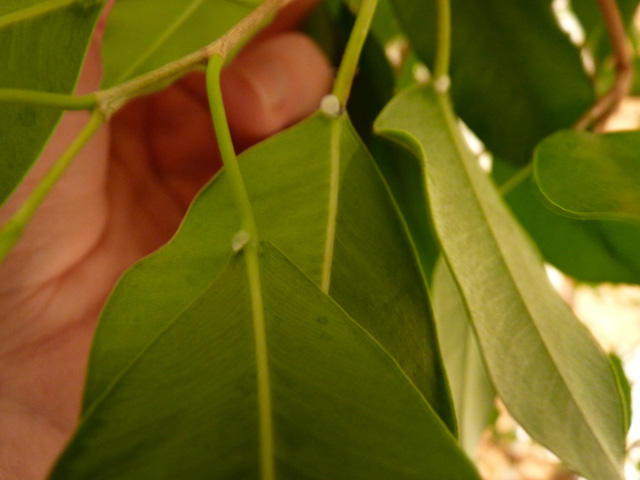 J'ai remarqué à ce qui ressemblerait à des boule de sève sur chaque jonction entre la feuille et la branche (voir photo) j'ai pensé à la cochenille farineuse ou autre, mais il n'y a pas de traces d'insecte ou de fibre blanchâtre.