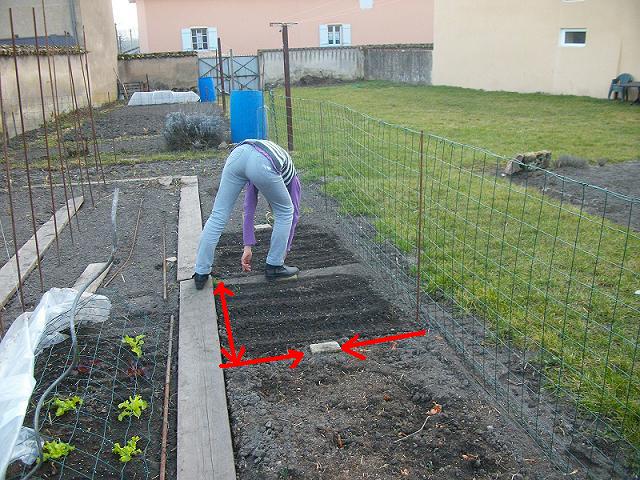 M'étant inspiré de Emcé, :top: j'ai des planches de cultures de 1m10 de large. Afin d'accéder au mieux, j'ai posé des vieilles tomettes qui servent de pas japonais. Ainsi mes "carrés " qui font, environ, 60cmx60cm sont accessibles plus facilement, sur le côté fermé par le grillage.
