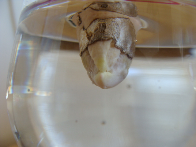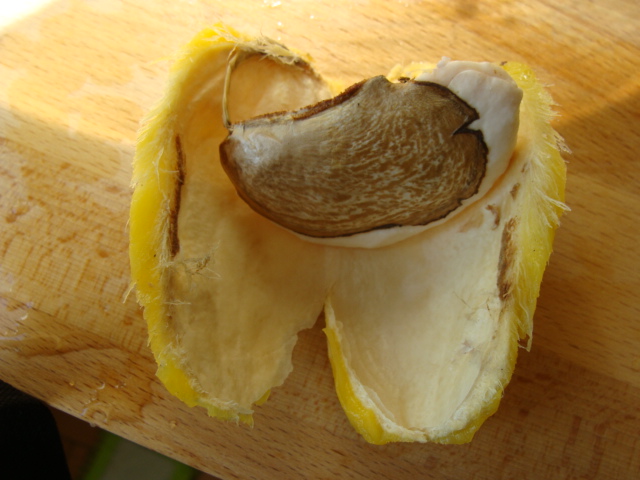 je l'ai goutee, pas terrible, pourtant elle avait l'air mure mais pas de gout. j'ai ouvert le noyau avec un ouvre boite et j'ai fait comme pour l'avocat: les fesses dans l'eau! vous trouvez pas qu'on dirait un poisson?