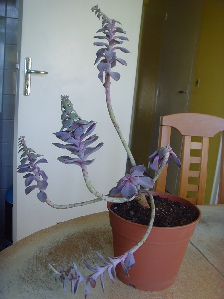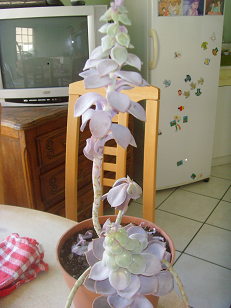 oui , une Echeveria lilacina, tristement étiolée , se dirigeant vers une source de lumière..Quand il ne gèlera plus il faudra la sortir, ou la placer derrière une fenêtre avec quelques heures de soleil