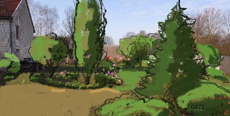 Après les arbres situé juste à droite d ela maison sur l'esquisse 3a je trouve bizarre les grands arbres, mais peux être c'est parce que j'ai comme prmeière impression que ça va rétrécir l'espace, ça m'avait fait cette inpression quand nous avions posé la cloture de bois et au final car a agrandit le terrain.
