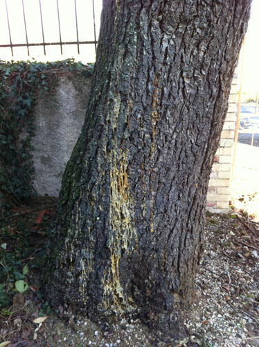 Sur une partie du tronc (photo 1) il y a une coulée de résine sèche qui part facilement en frottant.
