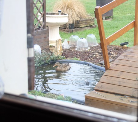 Cela m'arrange car cette petite canne viens faire un tour tous les jours. Mais elle repart après avoir reçu quelques morceaux de pain mouillé mais déposé loin du bassin il faut pas tenter le diable.